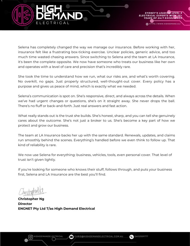 We now rely on Selena for everything: business insurance, vehicle cover, tools, and even personal protection. That level of trust isn’t given lightly, but she’s earned it through consistent excellence.